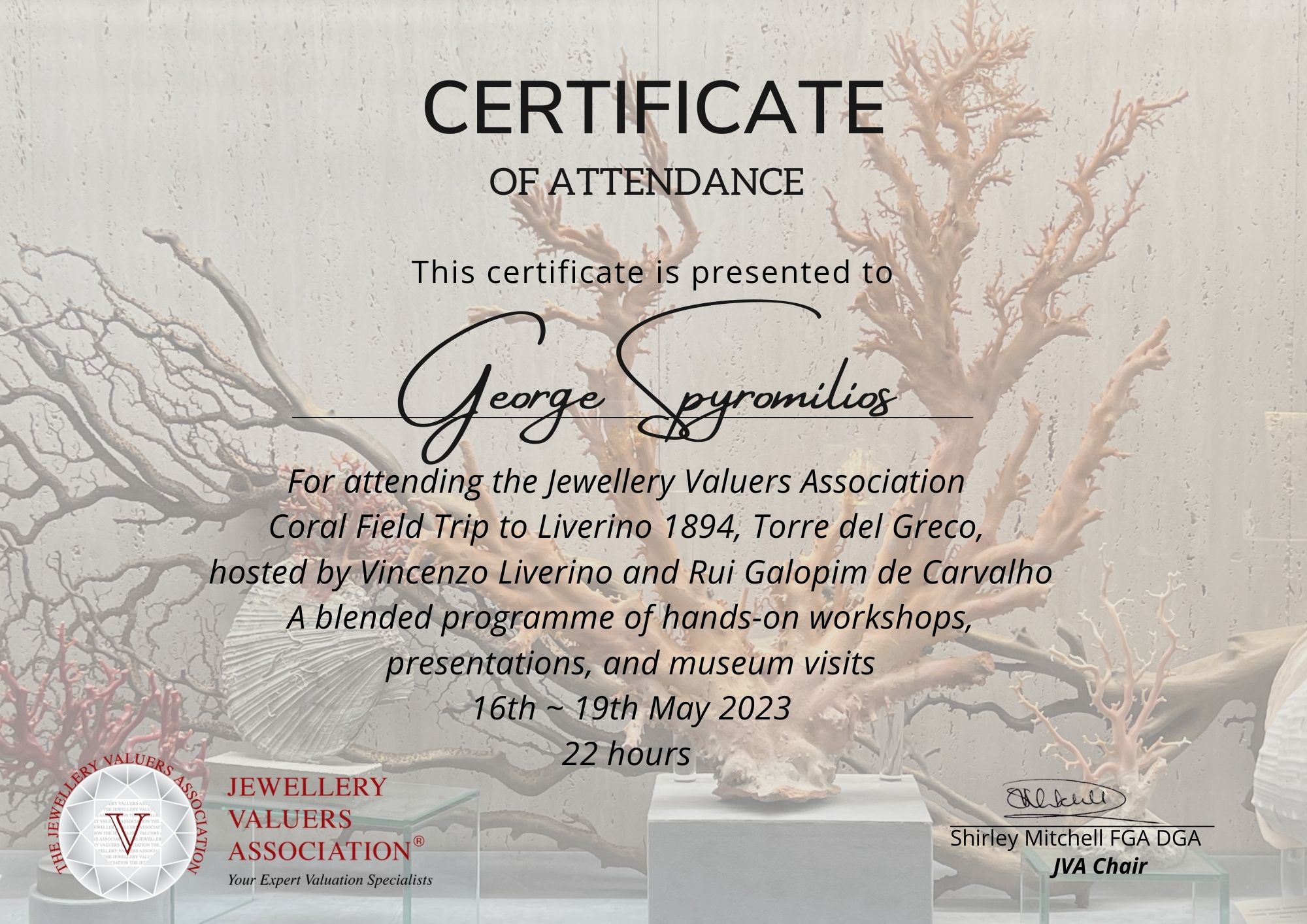Ο κος Γιώργος Σπυρομήλιος συμμετείχε στην εκδρομή του JVA στο Torre del Greco της Ιταλίας, με οικοδεσπότες τους Vincenzo Liverino και Rui Galopim de Carvalho. Παρακολούθησε εκπαιδευτικά σεμινάρια, παρουσιάσεις και εργαστήρια για τα κοράλλια, και πραγματοποίησε συχνές επισκέψεις σε μουσεία.